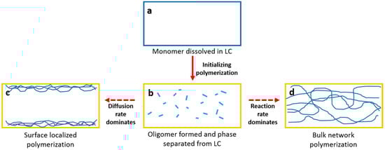 The sketch in Figure 12 may explain the possible mechanism of the surface localized polymerization of RM from the LC solvent. Before UV polymerization or exposure, the RM and PI are homogeneously dissolved in LC (Figure 12a). At the initial UV exposure (polymerization), photo-initiator molecules absorb UV photons and produce radical species. The free radicals will promote several bi-functional RM molecules to form oligomers by using a chain reaction. The oligomers are not very soluble to some extent and would decline when separated from the LC solvent (Figure 12b). As the oligomer increase its molecular weight through further chain reactions, the insolubility would repel the LC solvent by diffusing to the substrates while the chain reaction continues. If the diffusion rate dominated, the oligomer would be localized at (or close to) surface (Figure 12c), which is followed by a further polymerization reaction. If the polymer chain reaction dominated, the oligomer that would not have enough time to move the surface would undergo another chain reaction at its initial location, which would form the bulk polymer network (Figure 12d). In both cases, the final polymer would have preferred alignment because of the bi-functionality of the reactive monomer and the long-range order in the LC solvent aligned by the azodye sublayer. Previous studies on the polymer stabilized liquid crystal have described the effect of the diffusion rate versus the reaction rate in the formation of the polymer strand morphology [19,21,27]. A more bulk network will be formed if the reaction rate dominates over the diffusion rate. In our case, a similar result to the one proposed in Figure 12 should be discovered.