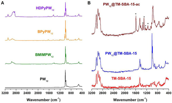 Different catalysts were prepared based on the Keggin [PW12O40]3− anion (PW12), namely, ionic liquid–PW12 (IL–PW12) hybrids and a composite material. The hybrids were prepared by replacing the protons in phosphotungstic acid by the cations of the ionic liquids, 1-butyl-3-methylimidazolium (BMIM), 1-butylpyridinium (BPy) and hexadecylpyridinium (HDPy). The number of ionic liquid cations in the hybrids was determined by elemental analysis. The composite material was obtained through the incorporation of PW12 into the mesoporous channels of amine-functionalized-SBA-15. The vibrational spectra of IL–PW12 (Figure 1A and Figure S1A in Supplementary Materials) exhibit the characteristic bands associated with anionic PW12, together with the bands ascribed to its cationic counterpart. In all spectra, the bands associated with PW12 stretching modes can be clearly observed in the 1100–800 cm−1 range, namely, ν(P–O), terminal ν(W=O), corner-shared ν(W–Ob–W) and edge-shared ν(W–Oc–W) by decreasing wavenumber [38,39,40]. The bands associated with the ionic liquid cations can be observed in the 3164–3064 cm−1 and 2970–2850 cm−1 ranges, corresponding to ν(C–H) of the aromatic heterocycles and aliphatic chains, respectively [29,41]. Moreover, the bands located in the 1173–1165 cm−1 range, which are clearer in the FT-IR spectra, can be assigned to the δ(H–C–C) and δ(H–C–N) modes in the heterocycles [31,41,42]. Regarding the PW12@TM–SBA-15 composite, the FT-IR spectrum (Figure S1B in Supplementary Materials) is dominated by the intense bands associated with the SBA-15 support, namely the νas(Si–O–Si), νs(Si–O–Si) and δ(O–Si–O) vibrational modes, located at 1082, 808 and 459 cm−1, respectively [43,44]. Some of the PW12 vibrational modes are occluded by the intense silica bands. However, the appearance of an additional band at 951 cm−1 and the increased relative intensity of the band at 808 cm−1, which can be assigned to the ν(W=O) and ν(W–Oc–W) stretches, respectively, point to the presence of PW12 in the composite material. The FT-Raman is an extremely useful technique for the characterization of siliceous-based composites due to their relatively weak Raman signals [19,45,46]. Therefore, the presence of PW12 on the composite is more evident in the FT-Raman spectrum, since the FT-Raman spectrum of PW12@TM–SBA-15 (Figure 1B) exhibits very intense bands in the 1010–860 cm−1 range that are associated with the characteristic PW12 vibrations [38,47]. The spectrum also displays the bands arising from the presence of amine groups, namely, the ν(C–H) and δ(CH2) vibrational modes in the 3031–2890 cm−1 and 1450–1410 cm−1 ranges, respectively [36,48]. The successful preparation of PW12@TM–SBA-15 was further confirmed by an elemental analysis which showed a PW12 loading of 0.056 mmol/g.