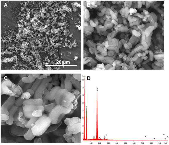 The SEM images of PW12@TM–SBA-15 (Figure 3) reveal that the morphology of the starting support is retained in the final composite. The images show hexagonal particles assembled in elongated structures which are typical of the mesoporous SBA-15 framework [44,49,53]. The chemical composition of PW12@TM–SBA-15 was evaluated by EDS spectroscopy (Figure 3D). The spectrum obtained is mainly composed of an intense peak assigned to silicon from the SBA-15 support but also by peaks assigned to tungsten which is consistent with the presence of the PW12 in the composite material.
