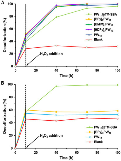 Initially, a comparative study was performed between the different IL–PW12 compounds using both biphasic systems: model diesel/MeCN and model diesel/[BMIM]PF6. Figure 4 displays the desulfurization results obtained using MeCN and [BMIM]PF6 extraction solvents. It is possible to verify that the activity of the three IL–PW12 compounds is similar using the [BMIM]PF6 extraction solvent (Figure 4A). Figure 4B demonstrates that the [BPY]PW12 catalyst did not promote any oxidation using the model diesel/MeCN ECODS system, since the desulfurization stopped after the initial extraction step (after the first 10 min). On the other hand, using the model diesel/[BMIM]PF6 system, the three IL–PW12 catalysts achieved complete desulfurization after 1 h of oxidation (Figure 4A). Only slightly inferior activity was observed using PW12 as the precursor; this is probably due to the fast cationic exchange with the IL cation, according to the preparative method of hybrid IL–PW12, described in Section 2.2.1. By comparing the results obtained with [BMIM]PF6 and MeCN solvents, it is possible to confirm that the [BMIM]PF6 as extraction solvent has a collaborative performance when activating the catalyst, since, in the absence of IL–PW12, the ECODS systems did not promote any oxidative desulfurization (Figure 4A). This behavior has been observed previously in the literature where [BMIM]3PW12 was used as a catalyst for the epoxidation of olefins, and low activity was found in the presence of MeCN solvent and a high catalytic performance was observed using [BMIM]PF6 IL solvent [54]. In fact, this IL can be used not only as a solvent, but also should supply a special environment that facilitates the formation of the active peroxotungstate compounds through the interaction of IL–PW12 and H2O2. In fact, the literature suggests that the mechanism for the oxidation of benzothiophene derivatives catalyzed by polyoxometalates (POMs) and using H2O2 as an oxidant starts with the formation of active species through the interaction of the oxidant (H2O2) and the WVI atoms of the POM (PW12 in this study) [16,26,46,55,56,57,58]. The resulting hydroperoxy- or peroxo-POM species are able to oxidize the sulfur compounds into the corresponding sulfoxides through a nucleophilic attack. The subsequent oxidation of the sulfoxides leads to the formation of sulfones. The oxidation promotes the continuous mass transport of sulfur compounds from the model diesel into the extraction phase ([BMIM]PF6) in order to restore the equilibrium of the extraction process. After 2 h of ECODS processes, the IL extraction phase was also analyzed by GC, and only sulfones and a vestigial amount of 1-BT sulfoxide was detected.
