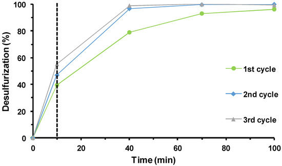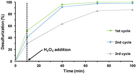 The continuous reuse of the composite catalyst PW12@TM–SBA-15 was performed following the procedure previously described for the reuse of the homogeneous IL–PW12. At the end of an ECODS cycle, after stopping the stirring, all solid catalysts remained in the extraction phase and the sulfur-free model diesel was removed and replaced by new sulfurized model diesel and a new aliquot of oxidant. The continuous reusability of the composite was evaluated for three consecutive cycles. The desulfurization profiles for the various cycles are displayed in Figure 7. When comparing the desulfurization performance of the composite catalyst in the three ECODS cycles, some differences were detected, mainly from the first to the consecutive cycles. In particular, an increase in sulfur removal was observed in the second and third cycles when compared with the first cycle. The complete desulfurization of the model diesel was achieved after just 1 h instead of the 1.5 h that was necessary during the first ECODS cycle. This increase observed in the second and consecutive ODS cycles should be related to the presence of previously formed catalytically active peroxo species [39,44,46,59,68].