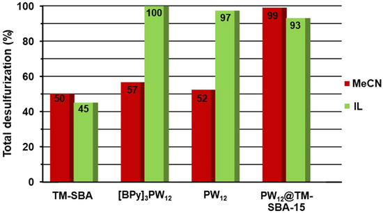 The ECODS studies were performed using this heterogeneous catalyst under the same conditions that were previously presented for the homogeneous IL–PW12. The model diesel was desulfurized using MeCN and [BMIM]PF6 extraction solvents (Figure 4). Contrary to what was observed with IL–PW12 catalysts, the catalytic activity of the composite PW12@TM–SBA-15 was considered similar in the presence of MeCN and IL extraction solvents. A difference in desulfurization efficiency observed during the first 30 min of the oxidation step was attributed to the lower initial extraction rate from using the IL extraction solvent (39% using IL instead of 57% using MeCN, Figure 4 and Table S1 in Supplementary Materials). Based on the superior activity of the composite compared to the IL-PW12 using the model diesel/MeCN system, the catalytic contribution of the support TM–SBA-15 was investigated (Figure 6 and Figure S2 in Supplementary Materials); however, it was demonstrated that this support material does not have any oxidative catalytic performance, since the desulfurization stopped after the initial extraction process, even in the presence of excess H2O2 oxidant, using either MeCN or IL extraction solvents. Using the model diesel/IL ECODS system it was possible to observe that desulfurization profile of the composite is slightly lower than that of the IL–PW12 homogeneous catalysts, since complete desulfurization was achieved after 1.5 h using the composite and 1 h using the IL–PW12 catalysts. By comparing the initial liquid–liquid sulfur extraction that occurred during the first 10 min for the homogeneous and heterogeneous ECODS catalytic systems, it is possible to observe that this was slightly higher in the absence of solid material, which may have contributed to the lower activity found with the PW12@TM–SBA-15 composite. The lower catalytic performance found using the composite may also have been caused by its dispersion between model diesel and the IL phase, unlike the homogeneous IL–PW12 that was immobilized in the [BMIM]PF6 phase during all ECODS process.