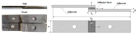 Inorganic phosphate adhesive has the advantages of a low expansion coefficient, corrosion resistance, and high temperature resistance and is widely used in aerospace. The base material used in the adhesive was aluminum dihydrogen phosphate (Al(H2PO4)3). The curing agent is mainly composed of aluminum oxide (Al2O3), and a corrosion inhibitor, pH regulator, curing promoter, etc., are then added, before mixing and grinding the sample thoroughly. Then, the curing agent is blended with the resin and cured at 180 °C for 1 h [5]. SiC pieces were first cleaned using tetrahydrofuran, followed by bonding with the phosphate adhesive. The size of the specimen was 60 × 20 × 3 mm3 (Figure 1), which was prepared according to the ASTMD1002-10 standard [22]. Specimens were put into an oven and cured at the designated temperature. The performance of the SiC and phosphate adhesive is listed in Table 1.