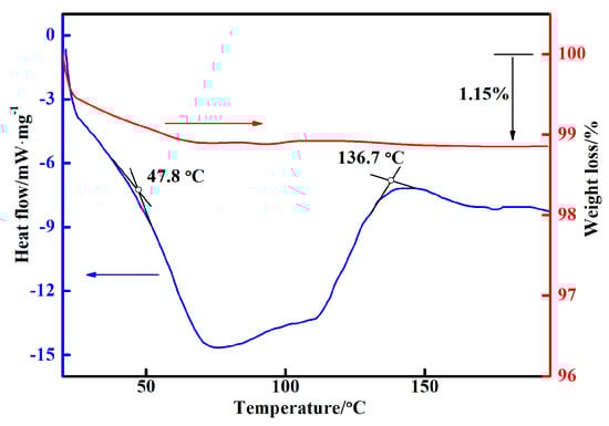 A scanning electron microscope (JEM1200EX, NEC Corporation, Tokyo, Japan) was used to observe the micro-topography. The adhesive was brittle fracture with liquid nitrogen, and the fracture surface was used as the test surface. A TG-DSC thermal analyzer (TG-DSC, STA449 F3, NETZSCH, Selb, Germany) was used to analyze the degree of reactivity effects at curing temperature. During the test, the heating rate was 10 °C/min in an argon environment with a mass flow of 30 mL/min from RT to 200 °C.
