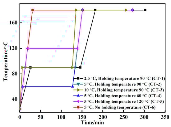 To design the curing temperature curves, differential scanning calorimetry (DSC) and thermogravimetric (TG) curves were used to test the inorganic phosphate adhesive (Figure 2), and the curing temperature interval of the phosphate adhesives was found to be between 47.8 °C and 136.7 °C. When the temperature increased, the TG curve decreased, which could be explained by the volatilization of water, resulting in weight loss. According to the curing temperature interval, we designed 6 curing temperature curves (Figure 3). When the heat preservation temperature was 90 °C, the heating rate was determined at 2.5 °C/min, 5 °C/min and 10 °C/min, respectively. When the heating rate was 5 °C/min, the heat preservation temperature was determined at 60 °C, 120 °C and without heat preservation for comparison.