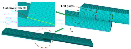 The FEM analysis was performed with an Abaqus® during processing. Figure 6 shows the numerical model and mesh for the joint using Abaqus®; the points marked in red are the micro-Raman spectroscopy test points. Figure 6 also shows the mesh detail for the = 10 mm bonded joints at the overlap. The models used 8-node hexahedral solid elements (C3D8R from Abaqus®) and COH3D8 8-node cohesive elements. The joints were clamped at one end, while another end was subjected to tensile displacement with transverse restraining to simulate a tensile process. Part of the adhesive layer was modeled with the triangular CZM laws, incorporating a mixed-mode traction-separation law between the faces of the elements, including the stiffness of the adhesive layer.