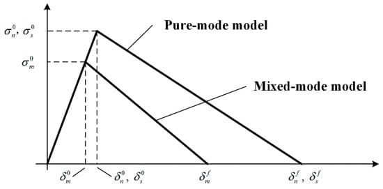 The cohesive zone model is based on the relationship between stresses and relative displacements (in tension, shear or tearing) that connect paired nodes of the cohesive elements to simulate the elastic behavior up to the cohesive strength ( in tension, in shear or in tearing) and subsequent softening to model the degradation of material properties up to failure. The triangular law (Figure 7) assumes an initial linear elastic behavior followed by linear degradation. Elasticity is defined by a constitutive matrix (K) containing the stiffness parameters and related stresses and strains across the interface: