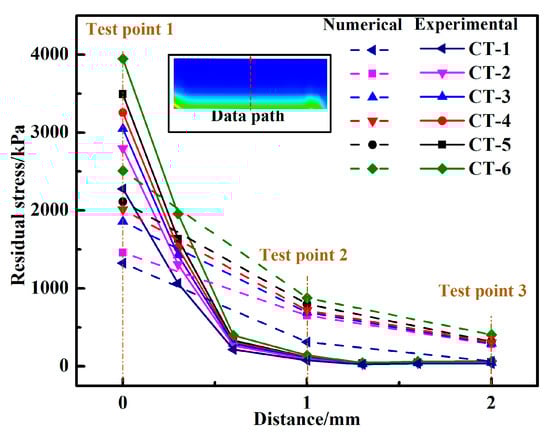 Figure 8 shows the experimental and numerical residual stress of the 1-2-3 test points with different curing temperature curves, in which the numerical results agree with the experimental work. The residual stress decreases when the distance between the test point and adhesive layer increases. In addition, the simulated results are larger than the experimental results, such that we speculate that the error is due to the residual stress in the specimen, which was reduced by pre-test polishing and washing. When the curing temperature curve CT-1 was used, the residual stress was lower than that of the other specimens. When CT-6 was used, the residual stress of the specimen was at its highest. This phenomenon can be explained by the high heating rate, which accelerates the curing process and improves the crosslinking density. Due to the temperature difference between the lap end and center of the adhesive layer, the adhesive layer is partially cured. The viscosity of the adhesive is changed rapidly, which also lead to reduced fluidity. The stress caused by the chemical contraction of the adhesive layer is difficult to release, which results in an increase in residual stress. The residual stress of CT-4 is less than that of CT-5, which resulted from the stage of heat preservation caused by the pre-cured effect. In the early stage of the adhesive curing process, the molecules did not participate in the interface bonding, with the adhesive still in a viscous flow state. The stress in the adhesive layer is released and the residual stress is reduced. Although the CT-5 was heated for 2 h at the end of the curing process, the residual stress could not be released due to the high heating rate during the curing period.