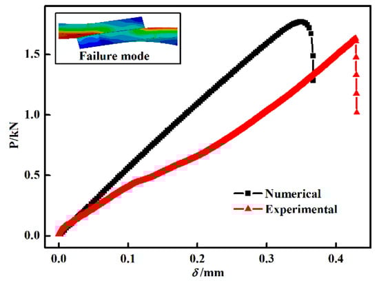 Figure 9 presents a comparison of curves for CT-1 between the simulation and experiment in which the curves of the numerical and experimental results were in agreement. However, there is an obvious fluctuation during the starting period of the experimental curve. We speculate that this fluctuation is due to a slight slip of the SLJ end in the fixture as the tensile load increased.