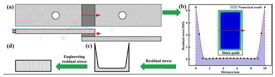 Schematic diagram of the residual stress transformation process to engineering residual stress. (a) specimen diagrammatic drawing; (b) residual stress distribution in test path; (c) residual stress; (d) engineering residual stress.