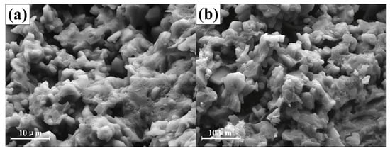 To further study the effect of the curing temperature curves’ mechanism on adhesive performance, the microstructure of the adhesive curing with different temperature curves (CT-1 and CT-6) was observed (Figure 12). As shown in the figure, there are many holes and fractures inside the adhesive. The microstructure of the adhesive in Figure 12a is relatively flat, and the pores and cracks are evenly distributed in the adhesive layer. Furthermore, we did not observe an obvious difference between the CT-1 and CT-6 specimen. Therefore, the two curing temperature curves had little influence on the microstructure of the phosphate adhesive, in which the primary reason for the decrease of shear strength is still the increase in residual stress.