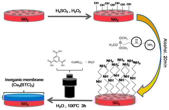 The MOF membranes were prepared by means of the hydrothermal method. The MOF membrane chosen was Cu3(BTC)2. Then, 0.7 g of cupric nitrate was dissolved in 19.2 mL of distilled water and solution A was obtained. Similarly, 0.336 g trimesic acid was dissolved in 19.2 mL ethanol and solution B was obtained. Solution B was then poured into solution A and stirred for 1 h. The mixed solution was poured into the Teflon-lined autoclave. The substrate of the functional porous SiO2 disk was placed in the Teflon-lined autoclave with tweezers at 100 °C for 3 d []. Then, the membrane was washed several times with ethanol and dried at 25 °C. The Cu3(BTC)2 crystals adhered to the membrane surface were washed away with ethanol and the dried MOF membrane based on the functional porous SiO2 disk was prepared by air-drying. A schematic diagram of the whole synthesis process is shown in Figure 1.