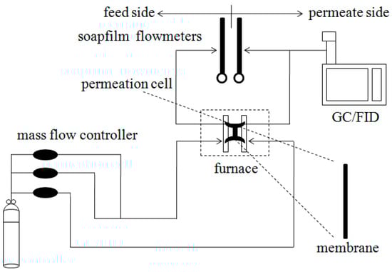 Prior to gas permeation measurements, the membranes were sealed in modules and swept by using Ar (sweep gas) and detecting gas. Meanwhile, the modules were heated to 80 °C and held for 1 h, then cooled to room temperature. Regarding both single component and mixture permeation, the permeate side and the feed side pressure were both set to 1 bar. Concerning mixture permeation, both feed gas and sweep gas rates were 80 mL min−1. A soap-film flow meter was used to measure the flux of the gas and the volume ratio of the mixture gas. This assembly is shown in Figure 2.