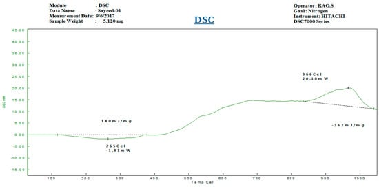 The of brake disc developed by EOS M-290 system and disc brake developed by DMLS process are depicted in Figure 3. Micrographs of disc brake surface, powder morphology analysis of top surfaces of disc brake under heat flux and temperature surface conditions were carried out by Zeiss EVO 50 (ZEISS, Jena, Vienna, Germany) scanning electron microscope (SEM). SEM micrograph of brake disc surface, shown in Figure 4 at radii 50 mm and 100 mm, represents the high temperature region of maraging steel by means of high energy collimated electron beam Leitz Aristomet (Leitz, Hicksville, NY, USA) microscope with high resolution and high depth of focus. Differential scanning calorimetry analyses, shown in Figure 5, were performed using HITACHI (Hitachi Systems, Chiyoda, Tokyo, Japan), Differential Scanning Calorimeter DSC7000 Series, TGDSC-DTA equipment at KELVIN LABS (Kelvin Lab Inc, Hyderabad, Telengana, India), in nitrogen gas atmosphere at three different heating rates (30, 40, and 50 °C/min) between 30 and 1000 °C, with scanning rate 0.01 °C to 150 °C/min, TG measurement range as ±400 mg. Maraging specimens were prepared by cutting small samples having a weight of about 5.120 mg. DSC tests were conducted to assess phase changes and reactions sequence. The DSC testing instrument consists of empty crucible and another one containing the maraging specimen. They are simultaneously heated and kept at the certain temperature. A DSC curve reveals heat flow, i.e. amount of energy exchanged by specimen versus subjected temperature. DSC makes it possible to study phase transformation sequence under precise non-isothermal temperatures. It was observed in DSC curve that MS1 specimen is stable. No phase change was observed during the testing temperature between 300 and 1000 °C. Typical DSC Specifications are given in Table 3.