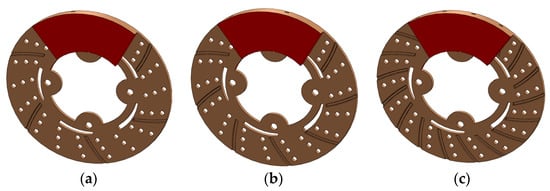 CAD model of brake disc and pad with (a) 6, (b) 9 and (c) 18 radial grooves on disc surface.