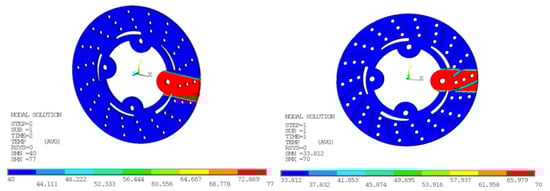 In Figure 9 and Figure 10, the temperature distribution of the disc brake is shown. Belhocine et al. [28,29], in their thermal studies on brake disc pad systems, tried to reduce thermal stresses by changing the design factors associated with the temperature distribution in disc brake and raises to squeal phenomenon. In comparison with experimental results, nodal temperatures obtained from FE simulation are in good agreement as surface temperatures Ts are reduced from 77 to 70.0 °C with and without radial grooves. The pressure distribution on disc surface area interface with brake pad taken at various times in FE simulation. For static deformation analysis, the pressure distribution scale varies from 0 to 3.0 MPa. The maximum contact pressure is located on edges of the brake disc and decreases from leading edge towards trailing edge due to friction. The maximum values of the thermal deformation vary from 979.336 to 433.938 µm with and without radial grooves, as shown in Figure 11. This value was obtained for speed of vehicle at 100 kph. The Comparative results of Static Deformation are given in Table 9. The same trend of the stress distribution was observed and highest stress areas are located in the same region with and without radial grooves. This pressure distribution is symmetrical compared with and without radial grooves.