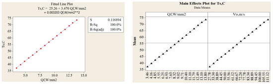 Fitted line plot for Temperature and heat flux and main effect plots for disc temperatures.