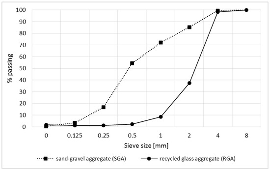 In the study, the traditional aggregate in the form of a suitably composed mixture of sand and gravel (SGA) was also used. The particle size distribution of aggregates used in the study is shown in Figure 2.