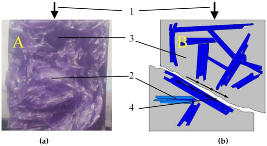Destruction of the CG-100 Sample Due to Compressive Stress: (a) Sample Fracture; (b) Scheme of Destruction Due to the Shear at the Interface of the RGA Grain–Polymer matrix; 1—compressive force direction; 2—SGA grain; 3—polymer matrix; 4—zone of destruction.