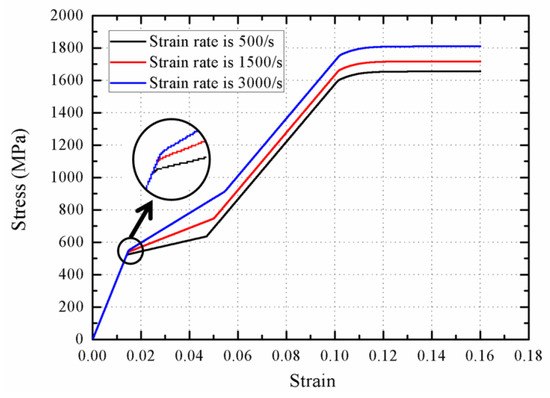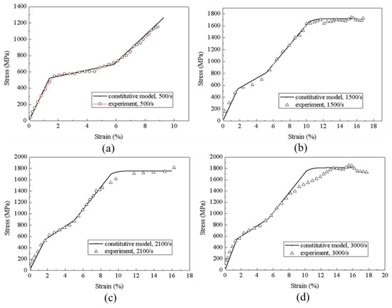 Dependence of the stress–strain response on various strain rates of (a) 500/s; (b) 1500/s; (c) 2100/s; (d) 3000/s.