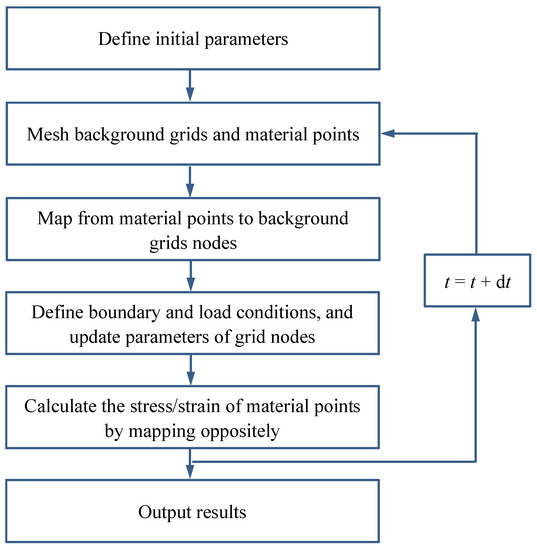 Then, the Cauchy stress is derived from the constitutive model. The flow chart of material point method is shown in Figure 6.