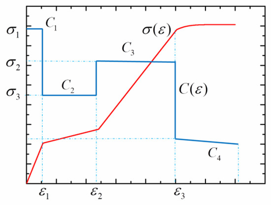 During the wave propagation in NiTi alloy rods, C is not a constant but a function of the strain ε. Such a phenomenon is different from the elastic wave. For a slightness rod with no initial stress, it is seen from Equation (68) that the strain increases by increasing the impact velocity. When ε reaches the plastic yield point, there is a three-wave structure in the rod, namely an elastic wave, a phase transition wave, and a plastic wave. Figure 8 exhibits the stress–strain response and the evolution of stress wave velocity.