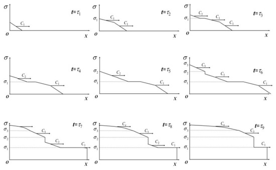 Indeed, four stages are always in an order of priority. The austenitic elastic wave appears at first. Subsequently, the phase transition wave occurs, and it is followed by the martensite elastic wave and the plastic wave. Because the martensite elastic wave speed is larger than the one of phase transition wave, the phase transition wave disappears when the martensite elastic wave exceeds the phase transition wave. Figure 9 indicates the stress profiles under some instantaneous stages. While it is just a schematic diagram with no physical meaning, the change in the slope of the stress profile is mainly used to differentiate the waves. From the figure, only the elastic wave propagating in the rod is found at and , with a velocity of C1. When , , and , the phase transition occurs on the boundary, and it propagates with a velocity of C2. Because the velocity of phase transition wave is less than that of the elastic wave, the distance between these two waves increases gradually. It is also discovered that the rod segment that is located at the critical point of phase transition becomes longer with the wave propagation. After the phase transition, the boundary enters the martensitic elastic stage at , and its wave propagates with a velocity of C3. Similarly, the wave velocity during the phase transition is less than that of the martensitic elastic wave. Thus, the phenomenon of martensitic elastic wave pursuing the phase transition wave is observed by numerical simulations. When , , and , the boundary reaches the plastic deformation stage. It is noteworthy that the elastic wave follows the phase transition wave until the latter disappears. Afterwards, such a three-wave structure degenerates into a double-wave structure, namely, two elastic waves and a plastic wave.