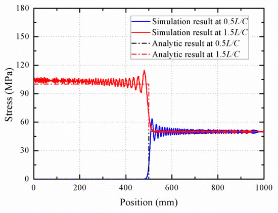 To verify the accuracy of the present theory and demonstrate its capability of prediction, Figure 12 shows the propagation and reflection of elastic wave in austenite phase. For comparison, and are chosen to exhibit the stress profile in the rod. As shown in the figure, the wave propagation and reflection of austenite elastic stage is identical to that of the general elastic wave, exhibiting no phase transformation. The stress wave velocity with C1 is increased by two times after it reflects from the fixed boundary. The difference errors indicate that the proposed model seems to be reasonable for the description of stress wave propagation and reflection.