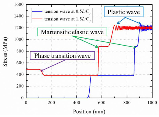 is found when . Therefore, the stress increment is not , but . Furthermore, Figure 13 shows that the reflection wave propagate goes back with the velocity of phase transition wave, which is only twenty percent of the elastic wave velocity with about 3200 m/s. Besides, it is found that the plastic wave velocity is similar to that of the phase transformation wave, by comparing the distance of the wave propagation in the same period, which is proved by the fact that the two waves propagate about 120 mm at the time step with . While the velocity of martensitic elastic wave is larger than that of phase transformation, the phase transition wave disappears in the initial stage of wave propagation. With the propagations of martensitic elastic wave and the plastic one, the rod segment that stays at the plastic yield point is expanded.