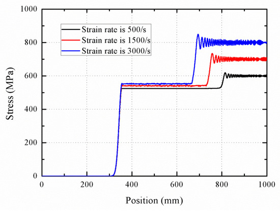 Equation (21) is used to describe the phase transition stress. Figure 16 shows the stress–strain curve with various strain rates, and in turn the stress profiles of wave propagation at 0.25 ms are provided in Figure 17. With increasing the strain rate, the initial phase transition strain increases by a slight manner. In contrast, the increase of final phase transition strain is significant, and the strain increases approximately from 0.05 at 500/s to 0.055 at 3000/s. It is evident that the stiffness of phase transition stage increases with the increasing strain rate. The wave velocity during the phase transition increase from 800 to 1200 m/s, indicating that the rod segment that stays at the initial point of phase transition becomes shorter with increasing the strain rate.