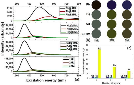 33]. The existence of such transitions manifests itself in the appearance of additional spectral bands at the absorption and fluorescence spectra or their quenching. In fact, the oscillator strength of the optical transition depends on the charge transfer between the analyst and the analyte. In the case of the weak physisorption of metals (controlled by the van der Waals interaction), the expected charge transfer is minimal, and the changes in the optical properties of the sensing material are believed to be negligible. In our previous work, optical transitions in monolayer quantum dots after binding with both neutral HM adatoms and divalent charged ions (Cd