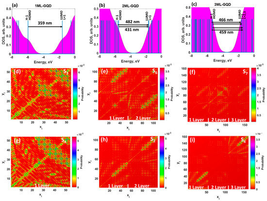 Figure 5h,i ), including the electronic transitions between occupied orbitals (that related to the strongly hybridized HOMO) and the lowest unoccupied energy levels (weakly hybridized LUMO and L + 1). In both cases, the wave function of the HOMO level is shared by the lead adsorbate and the topmost layer in stacked GQDs, while LUMO and L + 1 are mainly delocalized over the whole GQDs, with a small contribution from lead. According to the TDM representation for the corresponding excited states (S