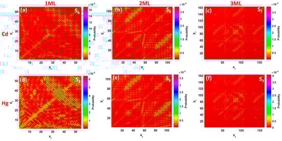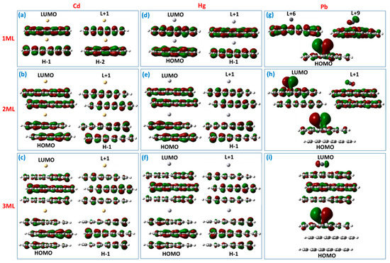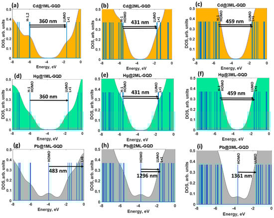 Figure 4a–f, it is clearly seen that the absorption spectra of GQDs interacting with Cd and Hg are dominated by the same optical transitions at 360 nm (monolayer), 431 nm (bilayer), and 459 nm (trilayer), respectively. The full assignments of the corresponding transitions are summarized for each absorption band in