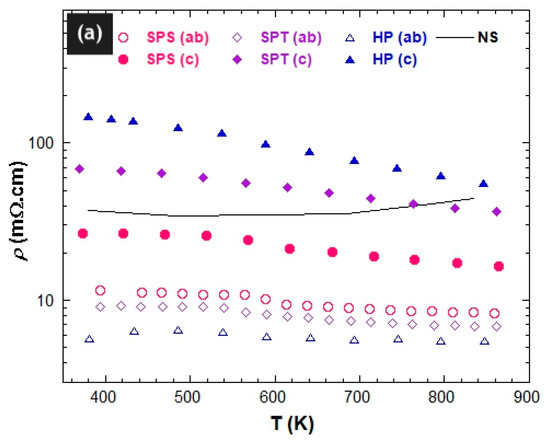The temperature dependence of the electrical resistivity ρ and of the Seebeck coefficient S was monitored in the 350–900 K range using a ZEM-3 apparatus (ULVAC-RIKO, Inc., kanagawa, Japan). These properties were measured on ~2 × 2 × 8–10 mm3 bars cut from the fabricated stacks along their two principal directions: parallel (ρc; Sc) and perpendicular (ρab; Sab) to the applied pressing axis. Figure 5a shows the electrical resistivity curves ρ(T) measured along these two main directions for thick textured SPS, SPT, and HP samples. The ρNS(T) curve recorded for the naturally sintered Ca3Co4O9 ceramic is also given for comparison. The ρ(T) curves exhibited a transition around 560 K reported to be assigned to either magnetic or structural transition [15,35], and this behavior was present for both measured directions irrespective of the texturing method used. Therefore, we noted two regions where the ρc(T) curves indicated first a slight decrease in transport behavior from 350 to 560 K, then a more pronounced decrease from 560 K up to 860 K, reflecting a semiconducting behavior. Noticeably, the ρc(T) transition around 560 K was more visible for the lowest textured samples; the SPS sample exhibited a more marked step compared to just a slope variation for both SPT and HP. The ρab (T) curves also exhibited a similar step but more pronounced. In addition, a ρab (T) metallic behavior was observed. This varied from up to nearly 500 K in HP, to below 400 K in SPT; for SPS, the value was not visible in our temperature range. Consequently, the resistivity behavior of our samples strongly depended on the achieved texture strength for both the anisotropy and metallicity. As usual, for strongly anisotropic crystal structures like Ca3Co4O9, stronger textures gave rise to larger resistivity anisotropies of the samples. However, because this phase also exhibited a different resistive behavior along c- and a-axes [15], their respective signatures were also visible in our textured samples. In the strong-texture SPT and HP, the metallic behavior was observed in ρab(T) and not in ρc(T), as only the (a,b) planes exhibited such metallicity in single crystals. In the low-texture SPS sample, which behaves like a random powder, the averaging over crystal orientations masked the metallic character down to 400 K. However, the peculiar behavior around 560 K has never been reported in the literature, and our measurements also show that the latter is texture-dependent, i.e., associated to the (a,b) planes. The SPS, SPT, and HP samples presented much lower ρab values compared to ρc (as also observed on single crystals) [15] and to the NS sample. The comparison with NS was largely ascribed to larger densification (>96%) of the textured materials, which also explains why ρcSPS(T) < ρNS(T) in the entire temperature range. Comparing SPS, SPT, and HP materials, the respective ρab decrease was principally tied to the texture strength and the (a,b) plane grain length (ℓab), which determined the grain boundaries density (GBDab) along the direction perpendicular to the pressing axis (mean (a,b) planes). The stronger the texture and/or lower the GBDab, the lower the ρab values. Their respective ρab values at 800 K were 8.5, 6.7, and 5.3 mΩ·cm corresponding to ~5, 6, and 8 times lower than the NS sample (42 mΩ·cm), respectively. The resistivity ρab of the HP-textured sample approached the values recorded in the single crystal (~3.8 mΩ·cm at 800 K) [15,36]. It was also close to the values reported for thin films by Sugiura et al. (~3.4 and ~3.9 mΩ·cm at 300 and 800 K, respectively) [37,38] and was even lower than the values published by Sakai et al. (~8 mΩ·cm at 300 K) [39]. This result reflects the role of the achieved texture and the low GBDab in achieving the electrical conduction in the (a,b) planes of the oriented Ca3Co4O9 ceramics.