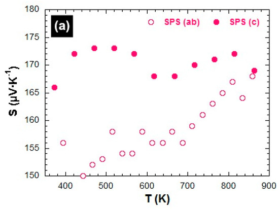 By contrast, the Sab seemed to decrease as the texture was reinforced and the GBDab diminished, particularly at high temperatures. Sab went from 172 μV·K−1 at 800 K for the SPS-processed sample to 157 μV·K−1 for the HP-textured sample. This is slightly lower than the figures reported for a single crystal (210 μV·K−1) [36] or thin films (185 μV·K−1) [38].