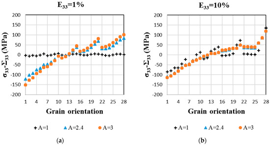 With increasing deformation, plastic strain incompatibilities arise primarily because plastic strains become much larger than elastic strains. Therefore, the incompatibility stresses and incompatibility strains of different anisotropy factor A will all converge to the same set of values. In Figure 5b,d, it can be seen that this convergence is not completely achieved at 10% of macroscopic strain. The full convergence is actually obtained at a macroscopic strain of 15% (not shown).
