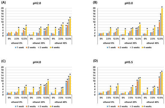 Mean color changes (ΔE) of the composite resin after different periods of storage (1-, 2-, 3-, and 4-weeks) in media of pH 2.0 (A), pH 3.0 (B), pH 4.0 (C), pH 5.5 (D) with three different pigment concentrations (0%, 2.5%, 12.5%), and three different ethanol concentrations (0%, 20%, 40%). An asterisk (*) represents a clinically noticeable color change (ΔE > 3.3).