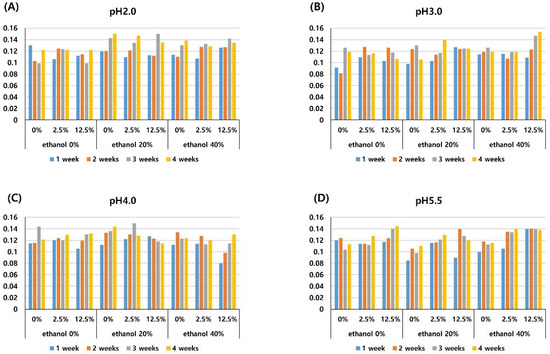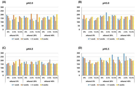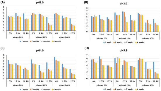 The acidity of red wine affects fermentation and maturation, prevents microbial growth and spoilage, and is important for its storage. A pH between 3.2 and 3.6 is recommended as suitable for the fermentation of red wine, and a pH range of 3.2 to 3.3 is suitable for its storage [39]. Therefore, pH values of 2.0, 3.0, 4.0, and 5.5 were examined in this study.