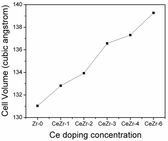 The behavior of the cell volume with the Ce doping concentration is displayed in Figure 2. A linear increase in the unit cell volume is found with the increasing Ce doping concentration. Cerium (0.97 Å) insertion at Zr (0.84 Å) sites is responsible for the increase in cell volume.