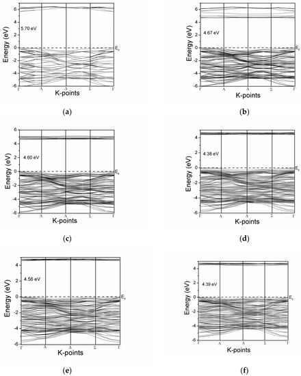 Band structure comparison of simulated models: (a) Zr-0, (b) CeZr-1, (c) CeZr-2, (d) CeZr-3, (e) CeZr-4, and (f) CeZr-6.