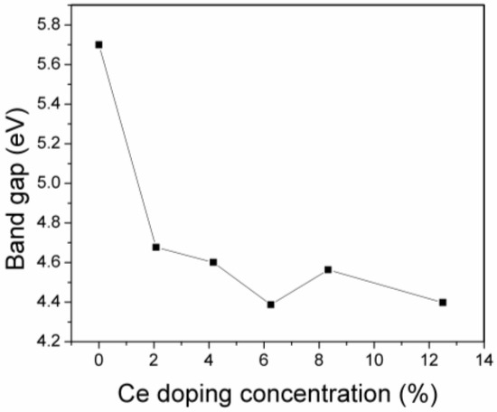 Variations in the band gap of Ce- ZrO2 system with increasing Ce doping concentration.