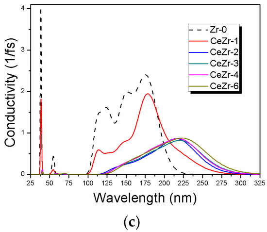 The optical properties of Ce doped ZrO2 modeled systems are displayed in Figure 6. Due to the intrinsic wide band gap (5.70 eV for ZrO2), pure ZrO2 is found to absorb high energy photons. As clarified from Figure 6a, pure zirconia has a strong absorption peak, around 38.6 nm and 54.9 nm. Moreover, a wide absorption band is observed starting from 101 nm and ending at 224.1 nm. These peaks might originate from the transitions of electrons between O 2p and Zr 3d states. Ce doping modified the optical response of ZrO2. Increasing Ce doping concentration created substantial change in the absorption curves of ZrO2. The CeZr-1 depicted an absorption peak at 39.4 and 54.0 nm, with less intensity compared to pure zirconia. The broad absorption band in case of CeZr-1 is shifted to longer wavelengths ending at 274.8 nm. The changes induced in the optical absorption spectra of CeZr-1 are attributed to the insertion of Ce 4f states in the band structure. It is interesting to note that the models CeZr-2, CeZr-3, CeZr-4, and CeZr-6 exhibit different behavior to upcoming photons. The peaks around 39 nm and 54 nm completely disappeared. Moreover, the broad peak is shifted to longer wavelengths starting at 122.7 nm and ending at 290.2 nm. One should note from Figure 6a that there is very small difference between the absorption spectra of CeZr-2, CeZr-3, CeZr-4, and CeZr-6. The shifting of the absorption peaks and the creation/disappearance of new/existing peaks are ascribed to the states introduced due to Ce doping. The imaginary of dielectric function is shown in Figure 6b. Peaks for Zr-0 and relatively smaller peaks for CeZr-1 are found at 38.6 nm, 54.0 nm, and 176.1 nm attributed to the excitations of electrons from O 2p to Zr 3d states. The optical absorption drastically changed in CeZr-2, CeZr-3, CeZr-4, and CeZr-6 modeled systems. The peaks around 38.6 nm and 54 nm disappeared, and the absorption hump is found centering at around 225 nm. Electronic transitions are responsible for the optical spectra. One should note that the band structure of the doped systems changed due to the creation of Ce 4f states, leading to modification in the optical spectra. The peak hump around 225 nm is attributed to excitations of electrons between O 2p to Ce 4f and Zr 3d states. The absorption spectra and the imaginary part of the dielectric function verify the band structure findings. Figure 6c summarizes the conductivity of the simulated models. Computational results of the conductivity of Zr-0, as seen from Figure 6c, show peaks at 38.6 nm and 54 nm. Following the peaks, a broad absorption is found starting at 99.2 nm and ending at 227.7 nm. The 2.08% Ce doped ZrO2 displays peaks with less intensity compared to Zr-0 at 38.6 nm and 54 nm. Moreover, the broad absorption hump is also found with reduced intensity. It is interesting to note that the hump starting at 101 nm for CeZr-1 is shifted to higher wavelengths ending at 275.7 nm. CeZr-2, CeZr-3, CeZr-4, and CeZr-6 demonstrate a single absorption band starting at 124.5 nm and ending at around 300 nm.