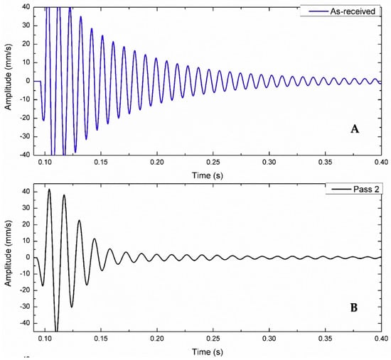 Figure 13 shows the time decay response for the as-received alloy after the second and third FSP passes. There are significant variations in the decay time between the base alloy and the other processed samples. In the first curve, the time wave was damped after 0.4 s, while the time wave was damped in 0.25 s in the third curve. Moreover, the number of decayed cycles was reduced by 70%.