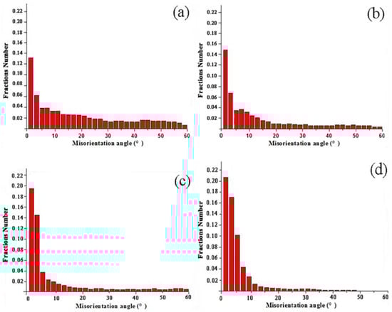 Figure 8. The grain refinement effect of MEM deformation was much better than that of MEE deformation. The low-angle grain boundaries decreased while the high-angle grain boundaries increased, which consumed a lot of dislocations. Besides, the dislocation density in subgrains decreases significantly. Much more new grains without dislocation tangle, which has great refinement effect to the original grains, could be observed in
