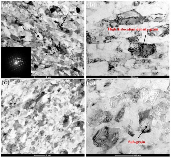 Figure 7c,d shows the typical microstructure of the MEE process. The deformed grains have a tendency to be elongated. The elongated grains could be broken into equiaxed grains, which cannot form inside the grains but along the grain boundaries. The process of MEE deformation does restrain dislocation movements inside grains and cells, contributing to some extent to the suppression of the cell recombination to form the grain boundary. In conclusions, the effect of grain refinement is much more remarkable after CECC deformation. The dislocation cells were formed by the slip and the accumulation of dislocations, which could be transformed into sub-grains with the increase of the strain.