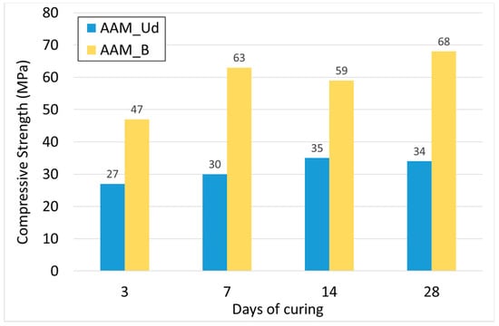 The higher amount of MK in the AAM_Ud is adopted to achieve consistent compressive strengths. As mentioned before, the chemical composition of B makes this waste material suitable for the alkali activation process. The presence of MK is needed to optimize the mechanical properties of the AAM_B. Both mixtures had the same workability and the different A/P ratio is mainly due the different absorption power of the mix of precursors. The performances in terms of compressive strength of both mixtures are shown in Figure 1 (avg. values of three samples). The tests were carried out on cubic samples (40 × 40 mm) initially cured for 12 h in the oven at 70 °C and then kept at ambient temperature and humidity in the laboratory.