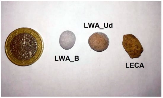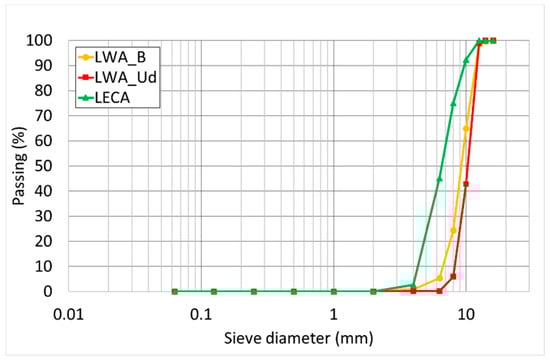 The particle sizes of the experimental aggregates are similar and can be classified as a 4/12.5 mm designation. The LECA grading distribution, even if classified according to the same class, is characterized by the presence of finer particles (Table 6).