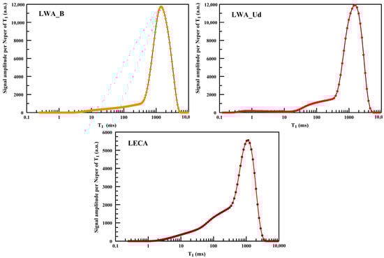 Furthermore, and likely for the first time, LWAs materials were also studied with the Time Domain (TD) Nuclear Magnetic Resonance (NMR) Relaxometry of protons (1H TD-MRR). This technique is an important non-destructive and non-invasive tool for analyzing the structure of porous media, ranging from biological systems [22] to cement [23]. TD-MRR is characterized by two relaxation parameters, the longitudinal relaxation time (T1), the transverse relaxation time (T2) and by a magnetization vector (the sum of the polarized nuclear magnetic moment associated to the 1H spins). Since a permeable porous medium is made of a network of interconnected pores of different shapes and sizes, when the TD-MRR experiment is performed on porous media fully saturated with water (or other fluid containing 1H as for example oil) the relaxation times will be influenced by the presence of the pore walls. Because of the auto-diffusion, a molecule of the saturating fluid continuously moves in the pore network and hits the pore walls, and so the NMR magnetization intensity relaxes back to the equilibrium over a region that is larger than a single pore (the so-called diffusion cell) [24]. TD-MRR data will therefore be averaged over the diffusion cell giving a local average information on pores. If the molecular diffusion is fast enough to maintain the magnetization uniform within the diffusion cell, then T1 and T2 show distributions of relaxation times that could be related to the distribution of pore sizes (PSD).