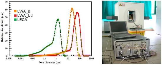 The TD-MRR PSDs obtained by calibrating the TD-MRR relaxation time distributions with MIP results are shown in Figure 6. The samples have significantly different PSDs. In particular, small pores in the range from few nanometers to some micrometers characterize the LECA aggregates. LWA_B and LWA_Ud have larger pores in the range of 0.1–200 mm. If the two experimental aggregates are compared, the LWA_Ud has the larger pores, with a consistent density of pores whose size ranges between 100 and 200 mm. Moreover, form the analysis of the area under the distribution curves, both experimental aggregates are characterized by a more homogeneous pore size distribution. These results are in line with that verified from the optical microscope images shown in Figure 3. The inner structure of LECA consists of small pores if compared to the experimental aggregates, while the Ud one has the largest diameter voids.