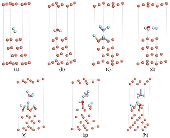 To clarify the effects of HF, PF5 on the adsorption of H2O, the bond lengths and bond angles of water on the Cu(111) surface are calculated from Figure 2b,d,f,g, which are listed in Table 2. It can be found that the H–O–H internal angle slightly increases from 103.199° to 104.939° with the simultaneous adsorption of H2O and HF. Meanwhile, the internal angle increases to 105.707° with the extra addition of PF5. No evident change was observed for the configuration of H2O molecules, showing that the adsorption of H2O is physical adsorption, which is consistent with the results illustrated by Chen et al. [27].